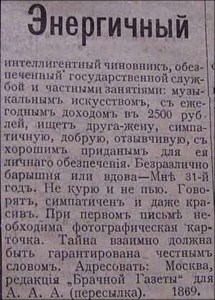 интеллигентный чиновник, обезпеченный государственной службой и частными занятиями: музыкальным искусством, с ежегодным доходом в 2500 рублей, ищет друга-жену, симпатичную, добрую, отзывчивую, с хорошим приданым для ея личнаго обезпечения. Безразлично барышня или вдова — Мне 31-й год. Не курю и не пью. Говорят, симпатичен и даже красив. При первом письме необходима фотографическая карточка. Тайна взаимно должна быть гарантирована честным словом. Адресовать: Москва, редакция «Брачной Газеты» для А. А. А. (пересылка). 1869.