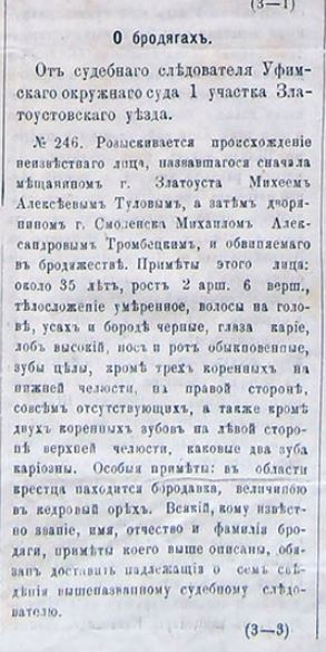 №246 Разыскивается происхождение неизвестного лица, называвшегося сначала мещанином г. Златоуста Михеем Алексеевым Туловым, а затем дворянином г. Смоленска Михаилом Александровым Тромбецким, и обвиняемого в бродяжестве. Приметы этого лица: около 35 лет, рост 2 аршина 6 вершков, телосложение умеренное, волосы на голове, усах и бороде черные, глаза карие, лоб высокий, нос и рот обыкновенные, зубы целы, кроме трех коренных на нижней челюсти, на правой стороне, совсем отсутствующих, а также кроме двух коренных зубов на левой стороне верхней челюсти, каковые два зуба кариозны. Особые приметы: в области крестца находится бородавка, величиною в кедровый орех. Всякий, кому известно звание, имя, отчество и фамилия бродяги, приметы коего выше описаны, обязан доставить надлежащие о сем сведения вышеназванному судебному следователю.